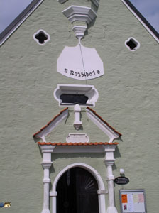 aus Stein gehauenen Portalumrahmung die Sonnenuhr und der Turm ins Auge.